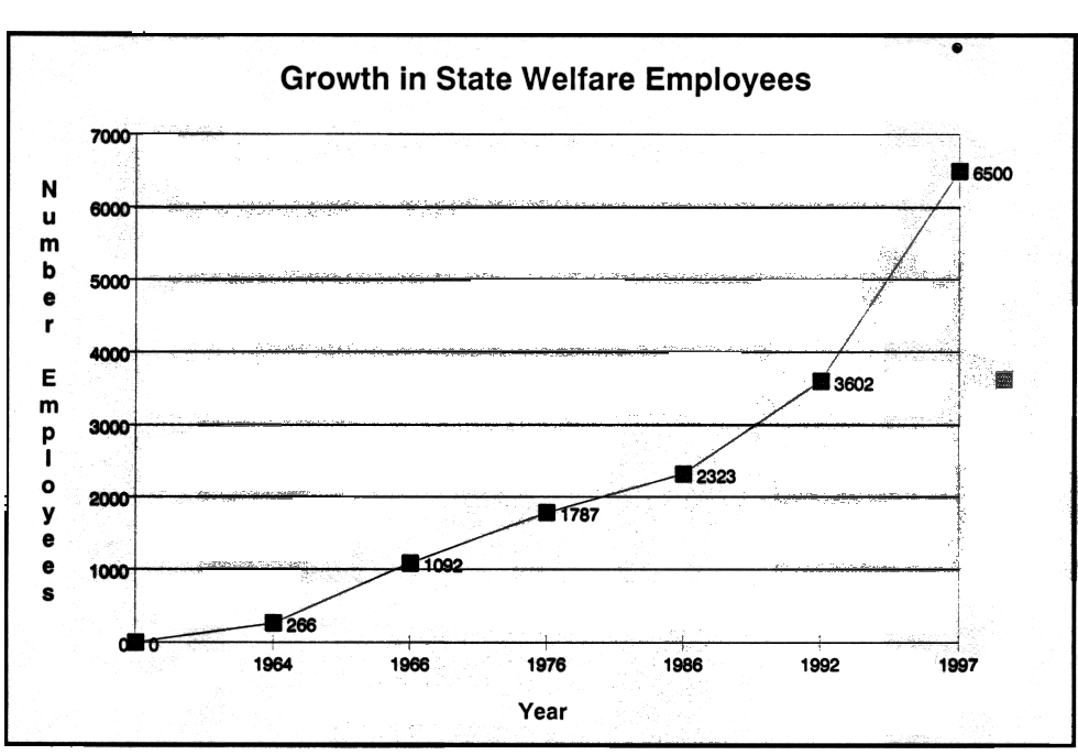 Source: The Council of State Governments Book of the States for the years designated (except 1997) and the Director's Office, Arkansas Department of Human Services for 1997 figure. Shown is a 2343% increase since 1964 in the number of welfare employees who are functionally active or directly supportive in the delivery of various "welfare" services in Arkansas. The latest figure, 65011, came from Director of DHS, Lee Frazier, who indicated by phone that the Department had just recomputed the number of people directly serving the welfare function and had set it at 6500. The actual number in Arkansas may be much higher because other welfare services are centered in other agencies, i.e. the Health Department. A more likely figure is 8000-9000. The population has increased slightly more than 30% since 1962. The poverty level has hovered around 21-22% of the population. |