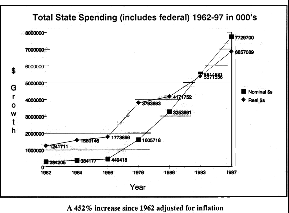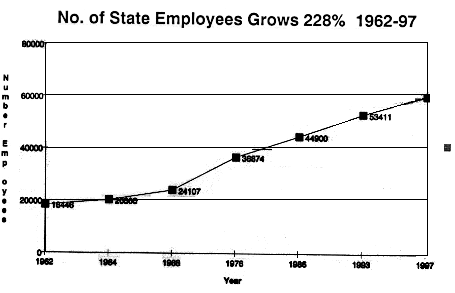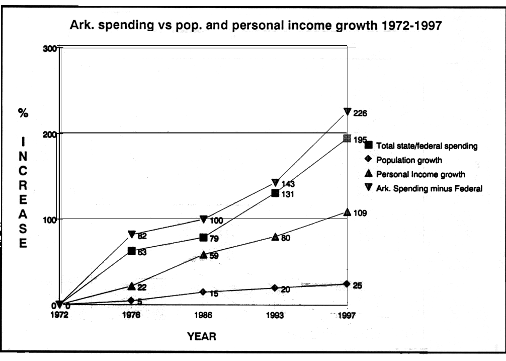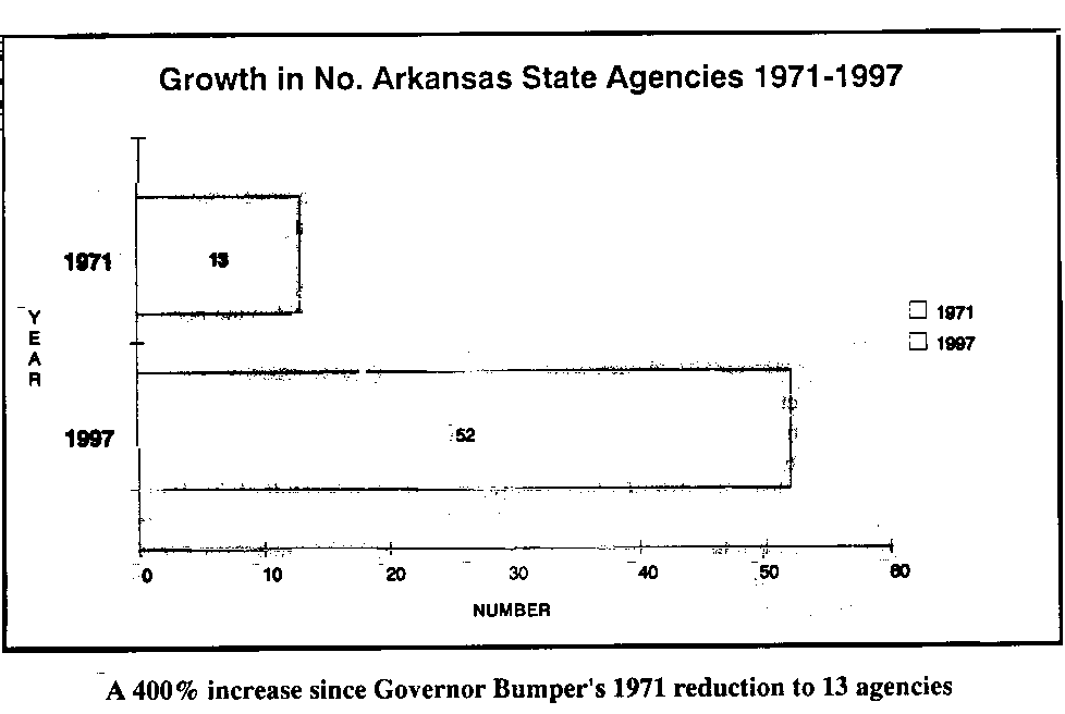 1. During the 1960s, Arkansas' state government expanded to comprise "170 state agencies possessing varying degrees of independence and run by persons appointed in a variety of ways." (quote from a 1978 report by Winston Bryant). By the end of the 60s, Republican Governor Winthrop Rockefeller wanted to scale state government back to a more manageable size. 2. It wasn't until a Democrat, Dale Bumpers, followed Rockefeller as the state's chief executive in 1971 that a state government reform plan was adopted by the state legislature. Under the plan, Bumpers consolidated more than 60 agencies into 13 major state agencies. He also shifted state government's day-to-day functions to a "corporate" model of management in which each agency head answered directly to the Governor as the state's Chief Executive Officer (CEO). Moreover, Bumpers designated the agency heads as his "cabinet". 3. State reorganization efforts during the 60s and 70s typically involved six steps to which Bumpers apparently subscribed: a) grouping agencies into broad functional areas aligned with more traditional functions of government, b) establishing relatively few departments to enhance the span of control and pinpoint accountability to the chief executive c) delineating single lines of authority to the CEO d) administering departments by single heads e) reducing confusion in service delivery for the public 0 cost savings and efficiency. 4. UCLA political scientist James Q. Wilson says, "Government always gets bigger." It appears he is right. In the period between 1971 (Bumper's reform) and 1978, the number of agencies slowly crept back up from 13 to 20, followed by a dramatic surge in bureaucratic growth in the years that followed. By the early 1990s the number of boards and commissions more than doubled and the number of state agencies quadrupled. The number of state employees more than tripled from 20,000 in 1978 to a current figure in excess of 60,000. During this same period (1971 to 1996) the population of Arkansas modestly increased by 25% and student enrollment in the public K-12 system remained essentially static at around 450,000. 5. Today, Arkansas' state government comprises 52 executive branch agencies--a 400% increase since Governor Bumpers' 1971 restructuring that reduced the number of agencies from 171 to 13. It also comprises 388 boards and commissions--more than double the 175 that existed in the early 70s. More than 4000 operational units are structured into state govermnent's various divisions and agencies according to state government organizational charts. The actual number is estimated to be more in the range of 7000-8000 distinct operational units. 6. Total state payroll for all state employees is $1.4 billion (1997) and the amount of travel expenses paid state employees in 1997 was $34.5 million. The State of Arkansas owns 1,073,522 acres of land making it the third largest land owner in the state (the Federal government is the largest). Of the state's property, 38,170 acres are in 48 state parks. Museums occupy 58 acres. The state owns 5,302 buildings. The total number of vehicles owned by the State of Arkansas is 7,281 and the number of airplanes is 30. Arkansas' highway miles total 16,254. The Federal Interstate System in Arkansas comprises 542 miles. 7. Arkansas' state government is the largest single employer in the state. Figures from the state's Employment Security Division (ESD) put the current number--including higher education employees--at 60,500, more than Wal-Mart, 32,412, Tyson's Foods, 21,500, and the Baptist Hospital System, 6,200. Factor in some 101,5001ocal government employees and the combined state/local government employee figure hits 162,000. Add in the 21,400 federal employees working in Arkansas and the total government employment figure (for all governmental levels) tops out at 183,400. The number of state employees, excluding the state's 57,257 public school employees, has risen 228% since 1965. 8. Among the fifty states, Arkansas ranks 33rd in population but 12th in numbers of state employees as a percentage of total state employment--4.29% (the national average is 3.2%). Expressed as numbers of state employees per 10,000 citizens, Arkansas ranks 23rd among the states at 220. The national average of state workers per 10,000 citizens is 182. 9. In 1981 Governor Frank White imposed a hiring freeze in Arkansas' state government and every governor since then, including Governor Mike Huckabee, has renewed the freeze with their own executive order. In spite of these restraint measures, the number of state employees has continued to grow, rising some 30% during a 16 year "freeze." Federal programs account for some, but not all, of this growth. 10. Arkansas school districts number 311. Arkansas ranks 17th among the 50 states in the highest number of school districts. Among its nine Southeastern state neighbors, Arkansas ranks first in the highest number of school districts, with 135 more than Kentucky, the next highest with 176 districts. Arkansas ranks 34th in school enrollment. 11. Eighty-six percent (86%) of Arkansas' Department of Education's operations are federally funded. 12. Boards and commissions have also undergone extraordinary growth since the early seventies when the number hovered around 175. Today the number of Arkansas boards and commissions is 388...and growing. A closer look at the trend shows that the median year of creation for all Arkansas boards and commissions is 1978, meaning half of them (in the 123 years since Arkansas adopted its current constitution) were formed in just the last 19 years. In 1983, Arkansas, led by then Governor Clinton and backed by both houses of the legislature, allowed its sunset law on boards and commissions to elapse. Some 37 states have sunset laws to govern growth of boards and commissions. 13. Total state spending (inclusive of federal funds) has risen sharply over the last three decades. Analysis shows that in 1962 Arkansas 