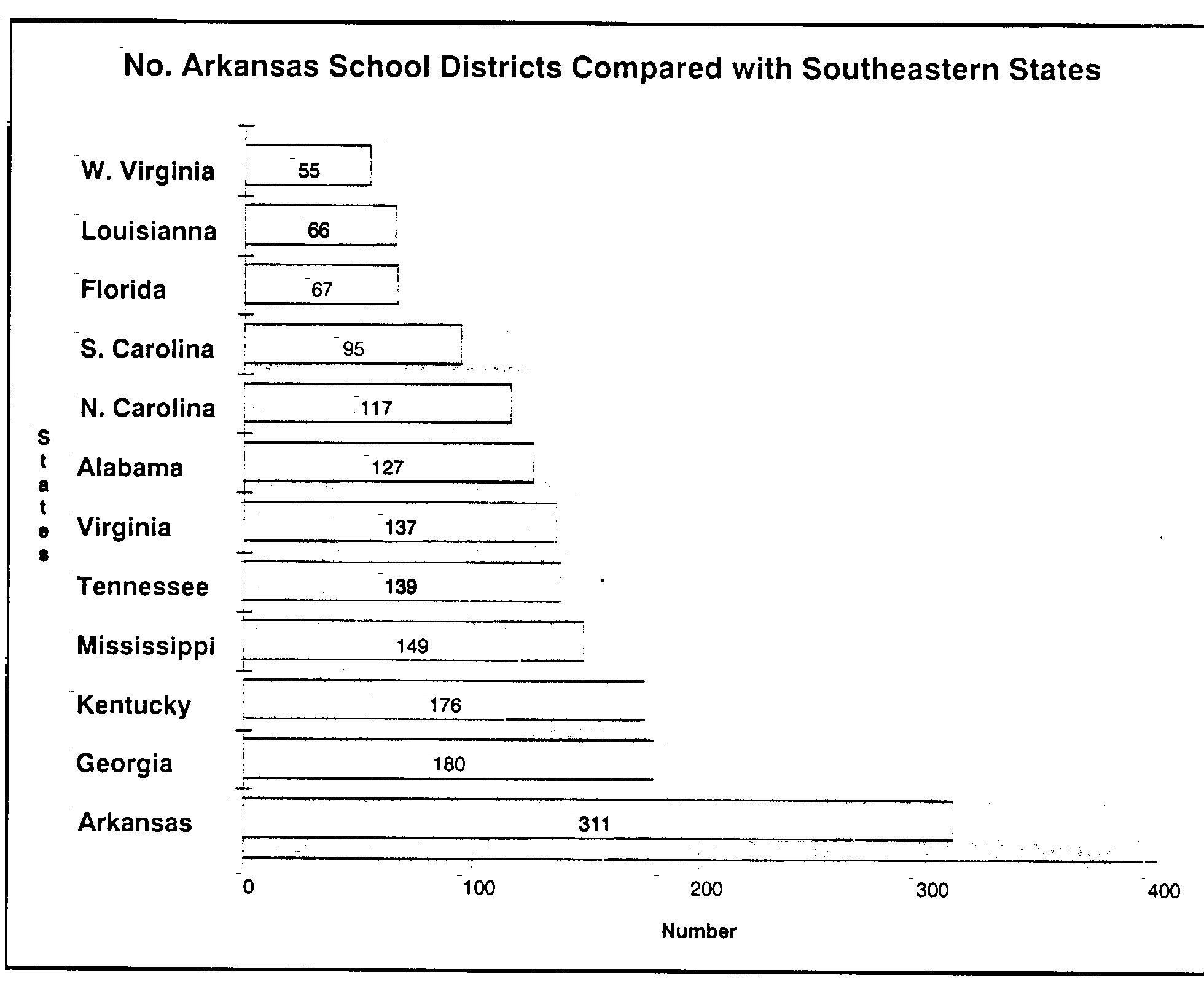Source: The number of Arkansas schools districts was provided by the Arkansas Education Association. Figures for other states supplied by each state's Department of Education. Arkansas ranks 17th among the 50 states in the highest number of school districts. Among its twelve Southeastern state neighbors, Arkansas ranks first in the highest number of school districts with 131 more than Georgia, the next highest with 180 districts. Arkansas ranks 34th in school enrollment. From 1970 to 1994, Arkansas non-teaching staff rose from 12,751 to 24,488, an increase of 94.8%. For the same period the number of teachers in the state increased 46.8%. Adjusted for inflation, per-pupil spending for non teaching/non-classroom activity in Arkansas has risen by 84.3% since 1972-73. EXHIBIT 5