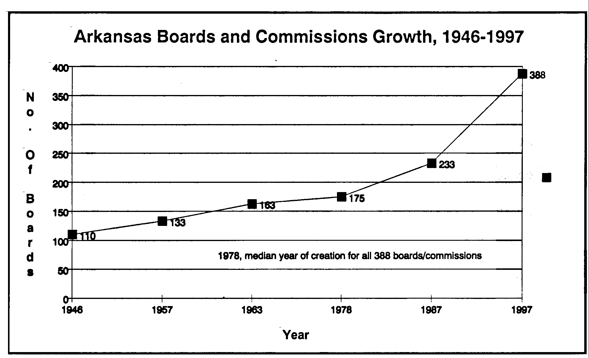 Source: Historical Report of the Secretary of State--Arkansas 1978, League of Women Voters Fact Sheet: Arkansas Boards and Commissions 1987, The Governor's Office on Boards and Commissions. More than half of Arkansas existing 388 boards and commissions have been created in the last 19 years (since 1978.) The year prior to that, 1977, Arkansas adopted a sunset law to control and manage the proliferation of state boards and commissions. In 1983, then Governor Bill Clinton and both houses of the General Assembly allowed the sunset law to lapse. Some 37 states have board and commission sunset laws. EXHIBIT 8