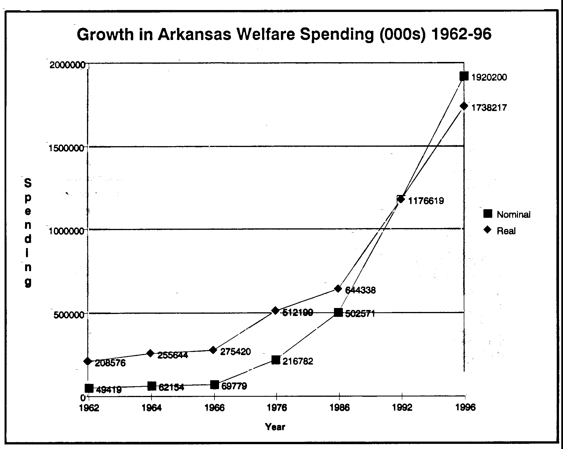 Source: The Council of State Governments, Book of the States for the years designated. Adjusted for inflation this rise in Arkansas welfare spending from 1962 to 1996 is more than 700%. EXHIBIT 11